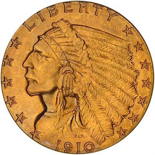 An exceptionally smooth quarter eagle squarely in the Gem MS65 class with delicate golden-orange color. Well struck for the issue without the usual softness seen on the ruffles of the war bonnet. Lustrous surfaces are virtually untouched by coin-to-coin abrasions.
