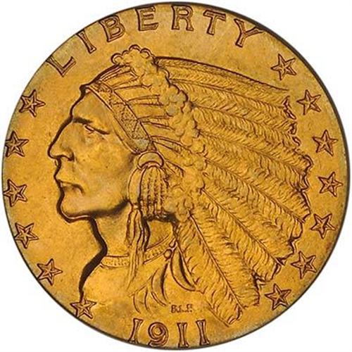 Lightning-bolt frosty mint luster and its rich, variegated golden color with coppery gold as the base tone (U.S. gold pieces back then were struck using an alloy of 90% gold with 10% copper for hardening, the copper imparted a slightly reddish tint to our gold coins.) This landmark issue, scarcest in the entire 15-coin Indian quarter eagle series, is only now and then found in Mint State 65. A nicely struck example, it exhibits fine detail to all the high points, in fact, needle-sharp relief in all elements, whether they be the feathers in the headdress, the ruffled front of the headdress, or the feathers in the poised eagle on the reverse.
