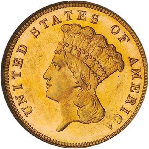 Heart-stopping quality. Each side has a beaming yellow-gold center that is surrounded by a nice margin of orange-gold mirror finish color. As in the case of the 1883 NGC Cameo Proof 65, a coin firmly grounded in its illustrious grade category, the fields show deep "orange peel" mirrors that have a trace of orange patina to them. The coppery gold color of $3 Proofs is lovely to view; those who have never seen one of these is missing a real treat. In short, this is a very flashy and ultra attractive Proof Three-Dollar gold piece, comparable in quality to some of the Proof 66 specimens we have seen offered. With only 291 Proofs made, competition for it is guaranteed to be strong.