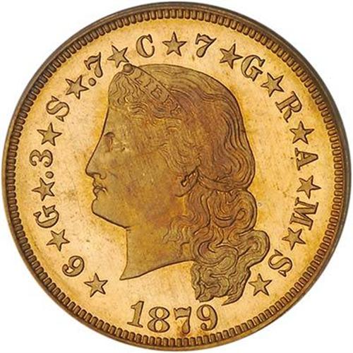 There were two obverse designs for the stella paired with a single reverse. This one with Flowing Hair was engraved by Charles Barber and another with Coiled Hair by George Morgan. Barber's design depicts Liberty with long, flowing hair; Morgan's version differs only in that Liberty's hair is tied in a bun. On both designs, Liberty is encircled by the lettering *6*G*.3*S*.7*C*7*G*R*A*M*S*, stating the proportions of gold, silver and copper in the coin. The reverse features a large five-pointed star as the central motif, with the incuse inscription ONE /STELLA/400/CENT. Both the U.S. motto E PLURIBUS UNUM and the Latin motto DEO EST GLORIA (God is Glorious) circle the star, in turn surrounded by the inscriptions UNITED STATES OF AMERICA and FOUR DOL.