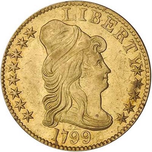 A desirable date from the standpoint of its delightfully low mintage of only 7,451 pieces! This is a far cry from the much larger results seen in 1798, 1800, and 1802-07. The coin itself earns its illustrious AU55 grade. Seen is an abundance of fresh, uncleaned golden frost, being close to 60% on the obverse where the frost merges into semi-prooflike reflectivity, and close to 95% luster frost on the reverse. Centers marginally weak at the eagle's shield and wing overlap, as usual. Choice fields, extra choice rims without adjustment lines, and pleasing old-gold appearance. Lastly, this charming example is housed in a first-generation holder.