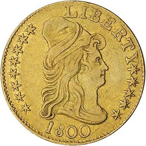 Traces of solder on the edge with typical roughened surfaces from its use in jewelry. Yet these little problems are inconspicuous in the overall attractive strike and color of the piece, an early half eagle. The year this piece was struck also happened to be an election year in America. It was a contentious contest, the election of 1800. Four candidates, including John Adams and Thomas Jefferson pretty much split the ticket -- throwing the decision to the House of Representative. After some backroom horse-trading, Jefferson was declared the winner -- and the country nearly tore itself apart through partisan bickering between the Federalists (represented by the Adams wing of the government) and the so-called Anti-Federalists, who backed the winner, Jefferson. In such panicky conditions, is it any wonder so many gold pieces of 1800 would be exported? Very few remain in collectors' hands, perhaps as few as 3% of the original mintage.