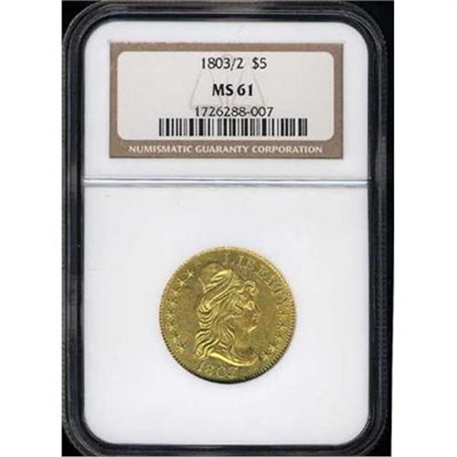 With only 33,506 1803 half eagles struck, and perhaps 97% to 98% of the original mintage exported, melted, or lost for all time, it stands to reason this attractive Mint State 61 would be something above the norm for the issue. The hair, stars, cap, and main reverse devices all crisply struck, indeed mostly bold, with mellow yellowish golden luster throughout that includes a few accents of reddish gold. Scattered marks affect the lower drapery, one on the cap, a few lighter abrasions in the field, putting this at average quality yet all the same a delightful specimen for the gold connoisseur.