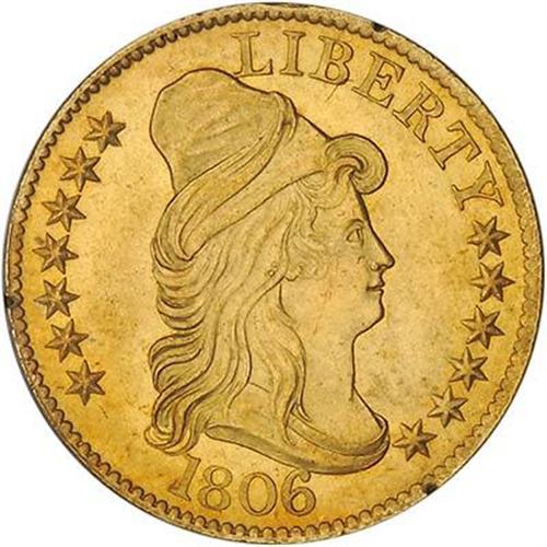 Effusive mint frost in amounts much too copious for mere Mint State 61 quality, it borders on a higher grade and is warm with flaxen-gold to orange-gold color. Centers are much sharper than average for the design, this having crisp hair curls, cap and lower drapery, equally crisp neck, wing and tail feathers for the eagle with a full but not quite complete shield. Scarce early gold has grown in popularity through the years, especially mint state quality gold.