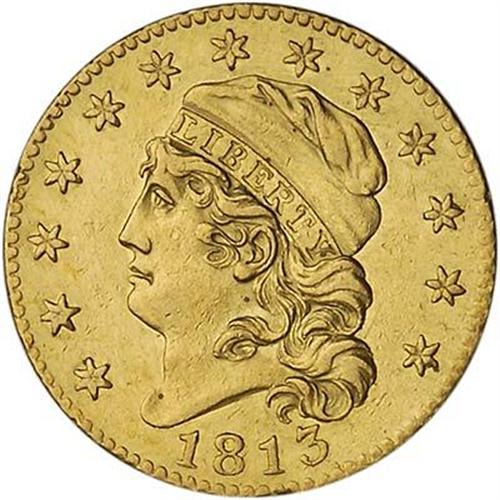Harshly cleaned, there are traces of mount removal on the rim, so inspection is recommended. First year of a new design, the 1813 issue also happens to be the final year that John Reich was employed at the U.S. mint in as engraver. This has his "signature" notch out of the 13th star -- later, post-1813 issues of all denominations no longer show this feature.