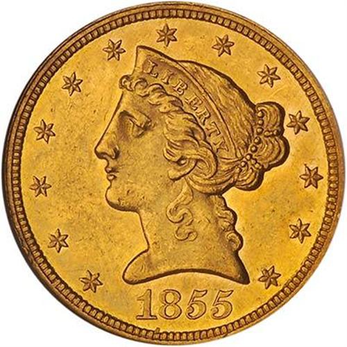 This is one of the more readily available No Motto $5 gold pieces, and Mint State examples are thus in considerable demand for Type set purposes. A few lightly scattered marks, but the surface exhibits pleasing warm golden luster.