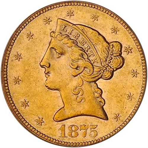 With a mere 9,000 struck of the half eagle denomination this year, this conditionally scarce offering displays excellent luster within and around devices (approximately 25% of the original bloom retained), and a low number of superficial blemishes for an AU53 coin. The strike is outstanding throughout the eagle and shield, and Liberty proudly displays complete hair including the broad curl overlapping the ear. Hair bun and beaded cord 100% crisp.