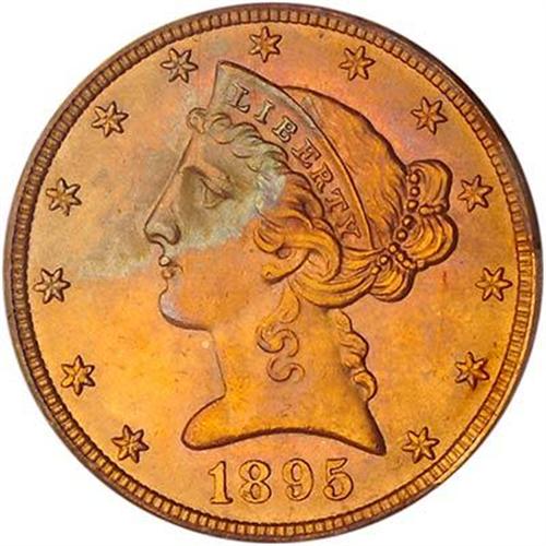 Features a wealth of beautiful orange-gold patina with virtually pristine luster. Well struck in all areas. The color is on a level of originality that collectors like. Furthermore, 1895-S isn't some common Philadelphia Mint product of the period -- the normally encountered half eagle from the 1890s. No indeed, only 112,000 were struck, with choice MS63 examples few and far between.
