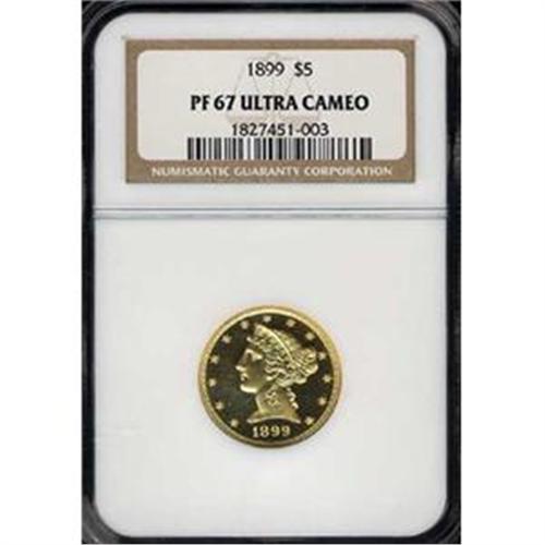 This razor-sharp 1899 has some utterly gorgeous cameo contrast between the golden-frosted devices and deep, deep mirrors whose "orange peel" effect ranks among the most delightful we've ever encountered. Beams of frosted mint luster and rich reddish gold hues accent the devices. Desirable with this meticulous strike, 1899 isn't extremely rare in lesser quality like Proof 63, but becomes almost impossible to imagine or duplicate at this Proof 67 level. The coin is housed in NGC holder 1827451-003.