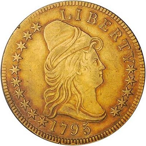From the first emission of gold coins struck by the fledgling Philadelphia Mint comes this charming 1795 $10 gold piece of "eagle" as it was designated in the Coinage Act of 1792. At the time, the $10 was the largest gold denomination issued by the United States. Crafted in traditional style, the head of Liberty faces left and wears a soft cloth cap of the then popular style among wealthy women. The small eagle grasps a palm branch in its claws and an olive wreath (signifying peace) in its beak. Only light wear exhibited in the fields and on the devices, with remaining luster found in the legends and around most of the main relief design. Color is dusky gold to orange-gold.