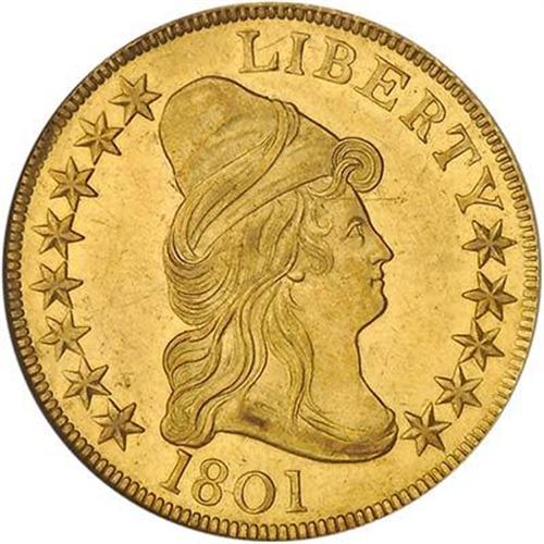 The peak of production for the early $10 design occurs this year, when 44,344 1801 capped bust eagles were struck. Two varieties are known, with one obverse die bearing a Close Date and another obverse bearing a Wide Date. Although eagles were delivered well into 1802, that year's production is believed to have been from 1801 dies. No 1802 capped bust eagles exist.