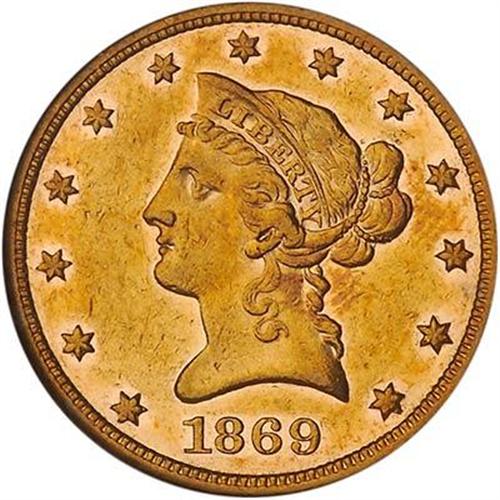 Having only 1,830 mintage (business strikes), what would you expect but that 1869 would be scarce to rare in all grades, especially above nominal Very Fine, the grade most often seen when seen at all! This attractive and well struck specimen boasts semi-prooflike fields and a very high NGC status, and is among the few survivors in About Uncirculated condition.