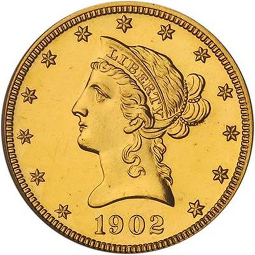 Remarkable quality. Each side has a flashy yellow-gold that is surrounded by a nice margin of razor-sharp rim dentils. The stars are 100% razor-edge, as are the main devices, with Liberty's hair and coronet amazing in its detail. The eagle, for its part, couldn't be sharper. Only 96 Proofs were minted in 1903. As all were struck from brilliant-finish dies, any satin effect on the devices seems to indicate an early impression by the dies -- although with only 113 struck, most could be called "early impression". And that is what this lovely 1902 Gem leaves behind on the viewer, an impression of sheer perfection and beauty seldom encountered nowadays. (The coin is housed in PCGS holder 71041556.)