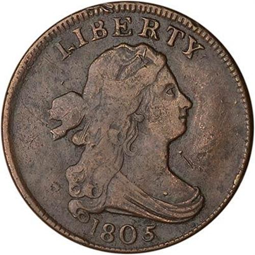 Ten points sharper with traces of extremely fine roughness under a rather glossy chocolate brown patina with medium brown highpoints. No verdigris, but there is some loose dirt in protected areas. There are a few contact marks, including a short, dull scratch in the field under the chin, a couple rim nicks at BE in LIBERTY, a nick in the hair under that R, and a hairline scratch through the tip of the hair ribbon, plus tiny rim bruises at the 1 in the date and above the bust tip. The swelling in the right obverse field is well advanced. The date is bold and the legends are strong, although the left side of the reverse is weakly struck while the right side is very sharp. The HA and CE in HALF CENT are weak, as usual. A nice example of the rare small 5 with stems variety, at the lower end of the condition census.