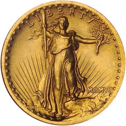 As was true of the 1907 Indian designs for the $10 gold, the present design was the result of President Theodore Roosevelt's orchestration with Augustus Saint-Gaudens, America's premier sculptor at the time. it was originally proposed that the entire spectrum of American coinage be refurbished, from the copper one-cent piece through the noble double eagle. In correspondence, Saint-Gaudens felt the 1857 Flying Eagle Cent was the finest motif found on any American coin, which is probably the reason he depicted a similar eagle on this High Relief reverse.