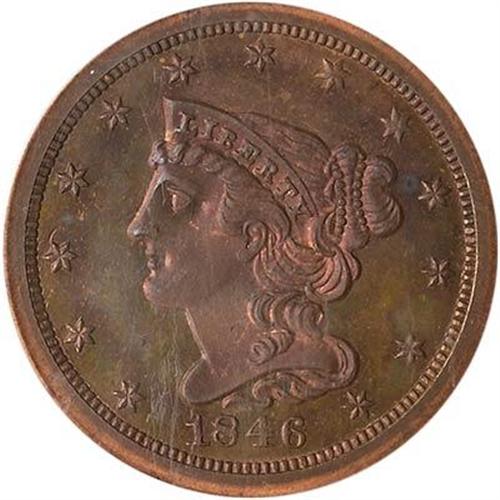 Faded mint red mellowing to bluish steel brown with rose overtones, about a third of the red remaining. There is a tiny speck of carbon left of star 10 and two small spots of darker steel toning hidden in the curl over the 6 in the date. Otherwise just a few of the usual struck-through lint marks in the fields, which are a characteristic of these proof strikes. The fields are moderately reflective but are covered with fine die polishing lines (not hairlines) that subdue the mirrors. These die lines are strongest on the upper half of the obverse and are present on all the second restrikes of 1846. A very nice example. EAC grade consistent with the slab grade.