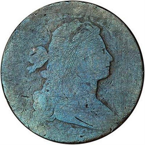 Mostly glossy dark chocolate brown with overtones of light bluish steel. No corrosion, but heavily worn and covered with myriad hairline scratches. The only significant mark is a collection of dull dents at the leaves under AT in STATES, and these dents caused a raised area in the lower curls. The upper half of the date is visible, the portrait is nearly complete, and the lower part of LIBERTY remains visible as well. The reverse retains about half the legend, but none of it is strong. The bisecting reverse die crack shows as a dull wave crossing through CENT. MDS. A very rare variety that's nearly always found in low grade with serious defects, and this one certainly fits that template.