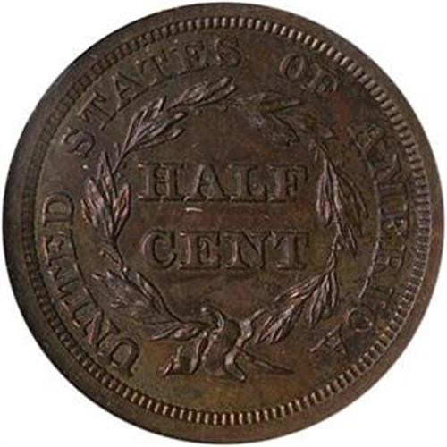 <B>Coronet Head Half Cent. 1857 Breen 1-B Proof-Only R4 NGC graded Proof-62 Brown.</B> Iridesce