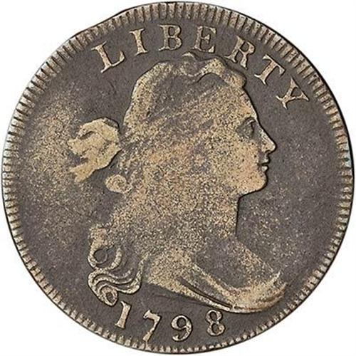 Sharpness VG10 but the planchet is slightly bent and the surfaces are covered with uniform microscopic granularity under a slightly glossy olive brown patina with lighter chocolate toning covering the highpoints. The two-tone appearance is attractive and helps accent the details. No verdigris, and the only mark is a light rim bruise opposite the chin. A curved planchet clip affects the dentils over LI in LIBERTY. LDS, Breen state VI. The date is bold and the legends are clear. Nice eye appeal for the grade in spite of the minor defects.