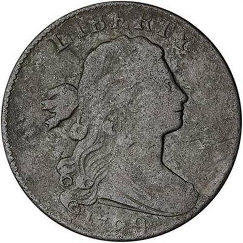 Sharpness F12 or slightly better but covered with uniform fine roughness. No verdigris, and the only marks are a couple small nicks under the L in LIBERTY and another in the hair left of the earlobe. Slightly glossy dark olive and steel with greenish olive toning in protected areas. Most likely lost in soil for some time, which would account for the color and surfaces. MDS. The date is clear although the bottom edge of the date is starting to flow into the rim below, and the overdate is visible. The legends are complete.