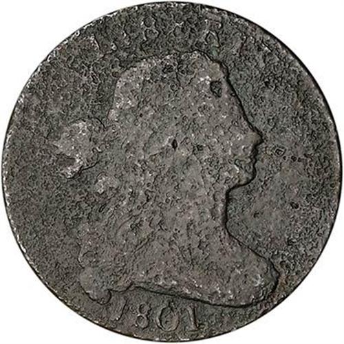 Sharpness VG8 but covered with moderate to strong corrosion, and there are specks of greenish verdigris in protected areas. The notable marks are a rather large pit on the forehead and a couple faint scratches hidden in the patina at the E in ONE and T in CENT. The date is strong and the legends are virtually complete, although portions are faint due to the roughness. The error fraction is very weak, but the first 0 in the error fraction (1/000) is the clearest of the 3 digits in the denominator. Ugly but one of only a dozen known, and the best is only VG8.