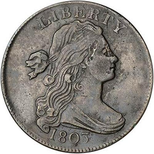 Sharpness VF30 with a long, dull nick or thin scrape in the hair left of the eye, and there is a small spot of greenish verdigris at the lower end of this mark. There are some additional tiny contact marks on the neck and traces of extremely fine roughness on both sides. A pair of tiny green pits on the rim at the bust tip are good identifying marks. Mostly glossy dark steel, the obverse mottled with some lighter steel brown tones. EDS, Breen state I.