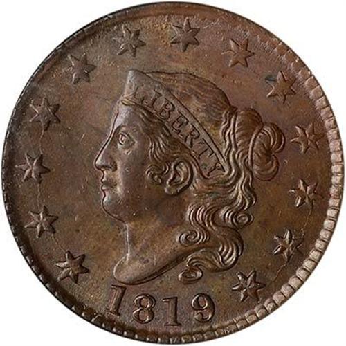 Lustrous medium brown with delicate overtones of bluish steel on the obverse and peeps of very faded mint color in a few protected areas. The only defects are a small carbon spot on the left tip of star 9 and a couple more under the end of the wreath stem. MDS with die rust coverring much of the reverse outside the wreath. An attractive example of the Large Date variety. EAC grade MS60+.