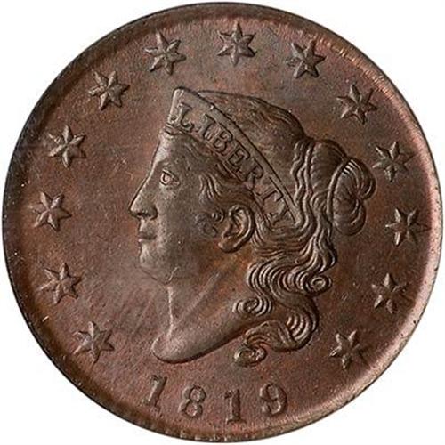Frosty medium steel brown and chocolate with very faded underlying mint red in protected areas of the obverse. A tiny spot of darker toning in the field over star 13 is the only mark. LDS, the usual Randall Hoard die state for this variety. EAC grade MS60+.