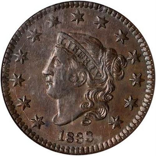 Frosty steel brown and chocolate with lustrous lighter bluish steel brown toning covering the protected areas. The only mark is a small spot of darker steel toning just right of star 1. Nicely struck E-MDS, the reverse rotated 30 degrees CW. EAC grade AU50. The attribution and Ron Adam provenance are noted on the NGC label.