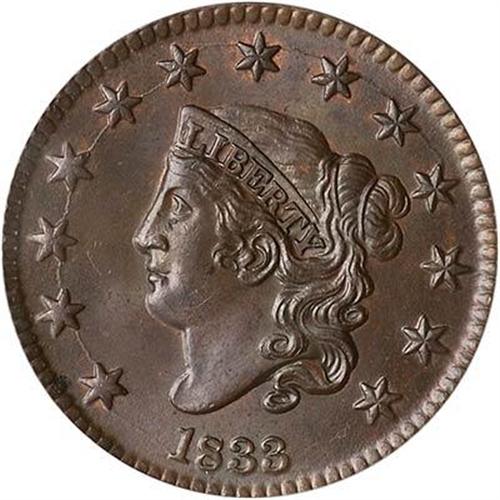 Highly lustrous bluish steel brown and chocolate with traces of faded mint red remaining on both sides and delicate overtones of sea-green covering much of the reverse. Outstanding luster and eye appeal. The only marks, and they are trivial, are a speck of dark crud close under the eye and a small spot of reddish toning on the leaf tip over the E in ONE, plus a speck of crud at the left top of the first A in AMERICA. MDS with the reverse rotated 30 degrees CW. The repunching on the 8 is clear. A premium example. EAC grade MS63.