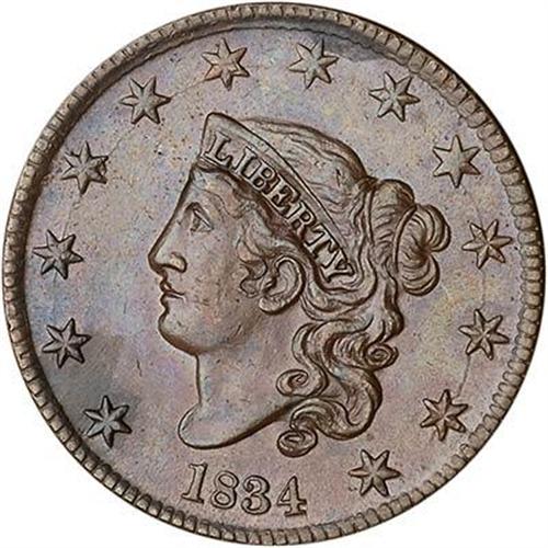 Frosty light steel brown with splashes of darker chocolate toning at stars 1-3, over star 7, and at AMERIC. Satiny mint luster covers the protected areas on both sides. MDS.