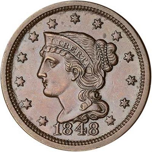 Choice glossy medium brown and chocolate. A tiny spot of dark crud in the field close over the inner hairbun and a small nick in the hair just left of the top of the ear are the only notable marks on otherwise beautiful surfaces. Sharply struck EDS, die state a. The repunching on the 48 is crisp.