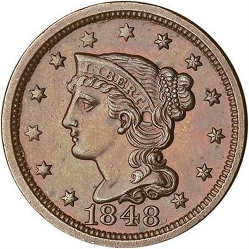 Glossy chocolate and frosty steel brown with faded mint red in protected areas, especially on the obverse. The notable marks are a small spot of darker toning left of star 1 and a very light rim bruise off the stem tip where the small rim cud is located. LDS with a small but clear rim cud break off the stem tip. Tied for CC#5.