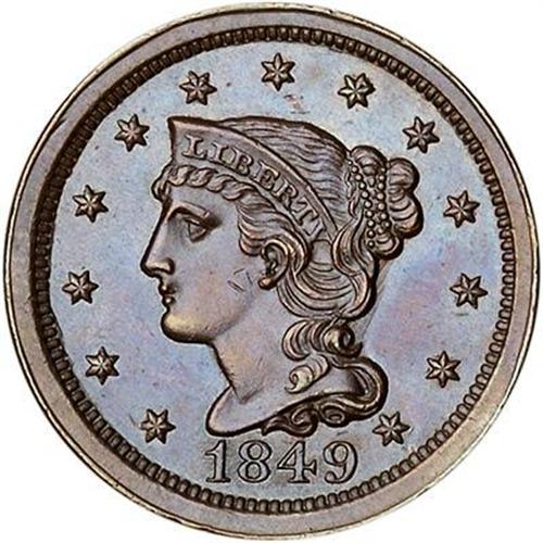 Lustrous bluish steel brown and chocolate. The only defects are three tiny ticks just left of the earlobe, a couple more in the field under star 7, and a small spot of slightly darker toning under the E in CENT. LDS, die state e. Lapping has removed the bar through the O in OF and the fields are smooth with hints of prooflike reflectivity. An attractive cent and a tough die state. CC#3 overall but finest of the late die state by a wide margin. Removed from an ANACS slab graded MS64BN (ANACS label included).