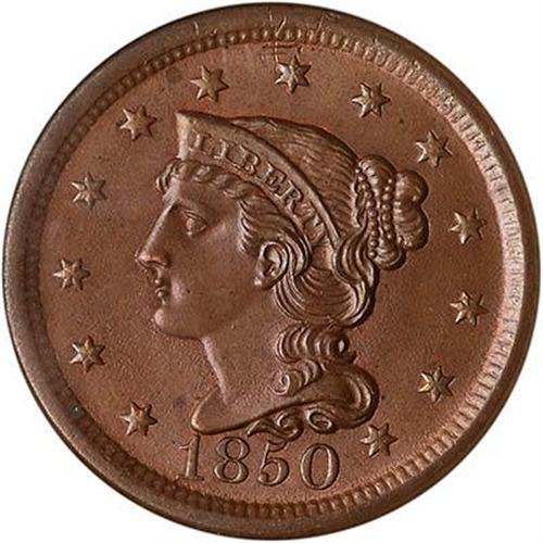 Frosty medium brown with hints of faded mint color in protected areas. The surfaces are satiny and attractive on the obverse, but the reverse is speckled with very tiny carbon spots. In addition, there are a couple short pinscratches at the dentils over star 7. MDS. EAC grade net AU58.