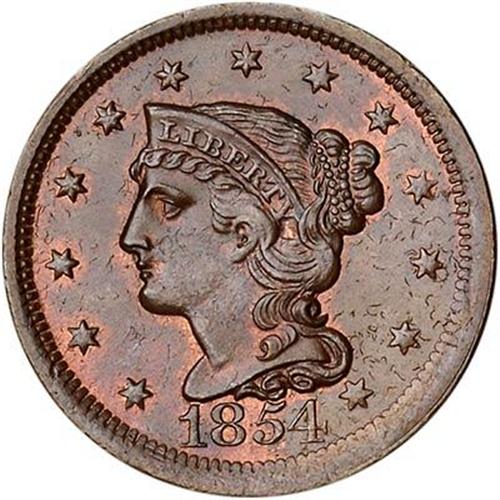 Highly lustrous light bluish steel brown with 20-25% of the red remaining, mostly on the reverse. A tiny planchet chip on the rim at star 2 and a light diagonal hairline scratch under EN in CENT are the notable marks. Would be a choice cent except for a low spot covering the upper half of the neck, lower half of the cheek, and the area at the ear. (Note: This variety usually has significant low spots, as struck, in all but the latest die state.) MDS, die state a late, with the die line at the 4 dull but visible. Tied for CC#6.