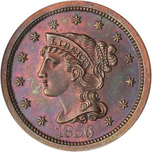 Very attractive bluish steel and iridescent rose faded down from mint color, at least 20% of the faded red remaining. The fields are nicely reflective and the mirrors are moderately deep with only faint hairlines. There are some tiny specks of carbon or darker toning on the obverse, the notable ones in the field off the lower lip, under star 6, and at the dentils over star 8. A light vertical nick in the field left of star 10 is the only contact mark. Excellent eye appeal. One of the most skillfully executed proof-only varieties in the large cent series. EAC grade Proof-63.