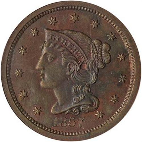 Small Date. Proof-Only. Bluish steel brown with underlying faded mint red covering about a third of each side and delicate clouds of darker bluish steel toning on the obverse. There is a tiny speck of light carbon just right of the N in ONE and a small planchet flake or struck-through void close under the earlobe, as struck. The fields on both sides are covered with fine die polishing lines, and those fields are nicely reflective. Needle-sharp and very attractive. EAC grade Proof-63 and tied for CC#2. Ex Herman Halpern, Stack's 3/16/88:774-2002 ANA Sale, Superior 8/1/02:303.