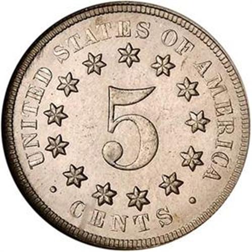 <B>Shield Nickel. 1867 No Rays. NGC graded Mint State 66.</B> Devices were struck with energy a
