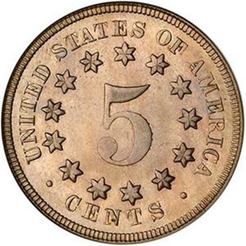 <B>Shield Nickel. 1867 No Rays. NGC graded Mint State 65.</B> Save for the highpoints of the sh
