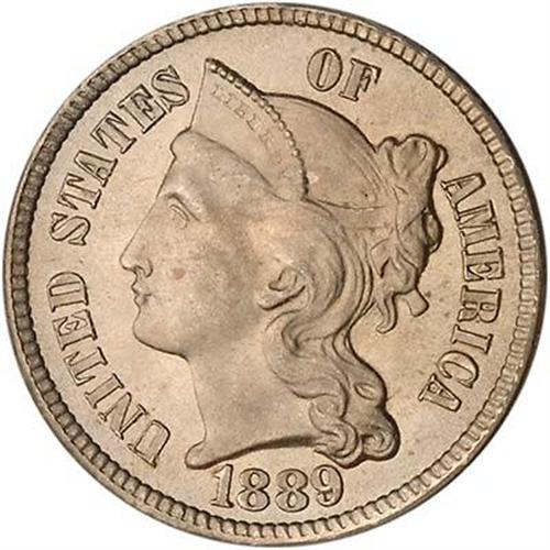 A sparklingly bright gem with rich frosted iridescence on both sides. Nickel three-cent coins were minted every year from 1865 to its last year of 1889, when, in a move to normalize America's coinage, the congress passed a bill which did away with the pointless denominations like the three-cent piece, the gold dollar, and the three-dollar gold.