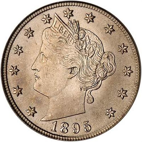 An incredible array of rich bright nickel-white luster graces the surface of this lovely gem 1895 Liberty nickel. One or two marks are all that we find (and these are minimal), while the devices are extra sharp for the year, with the only soft spot being the usual left ear of corn on the wreath.