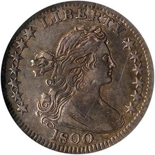 Deeply toned surfaces suggest this coin was a part of an old-time estate or collector's cabinet from the earliest times. It has attractive fields, but the usual slight unevenness in the strike on either side (due to the thin planchet and difficulty in forming complete designs from the pressure on the dies). Two main varieties are known for 1800, this, having a perfect LIBERTY and one other in which because of a minor break in one of the letters, the word appears LIBEKTY. Neither is particularly earth shattering in rarity, hence, the 1800 date is often chosen for a 19th century United States Type set of coins.