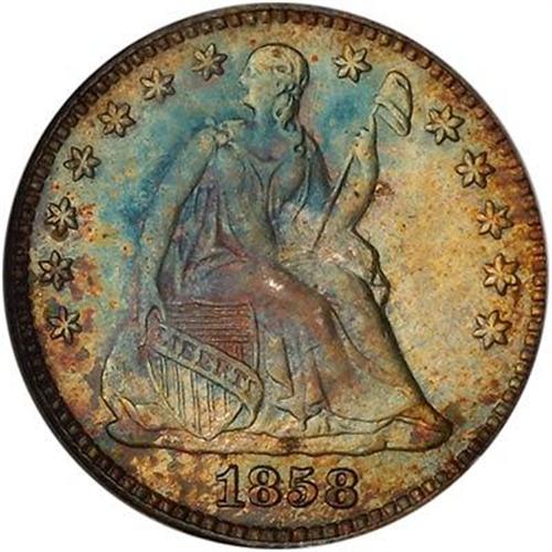 This is a lovely, radiant Gem, both sides being essentially blue toned with frosty, luster and a few patches of warm brown toning. Struck with systematic exactness throughout, much better on average than other 1858 half dimes, although not quite 100% razor-sharp (half dimes from the 1850s rarely are).
