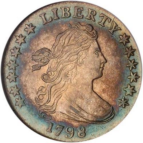 Pleasant silver satin surfaces display lots of luster underneath well developed toning. The color shades from light silvery golden in the center to deepest steel with some eye-popping blue iridescence at the rim, possibly the result of years of being stored in an old coin album. Mintage for the entire 1798 run (comprising at least four major varieties, including two overdate varieties) was a mere 27,550 pieces! A very scarce coin in Mint State condition. This attractive specimen encased in NGC holder 1900125-004.