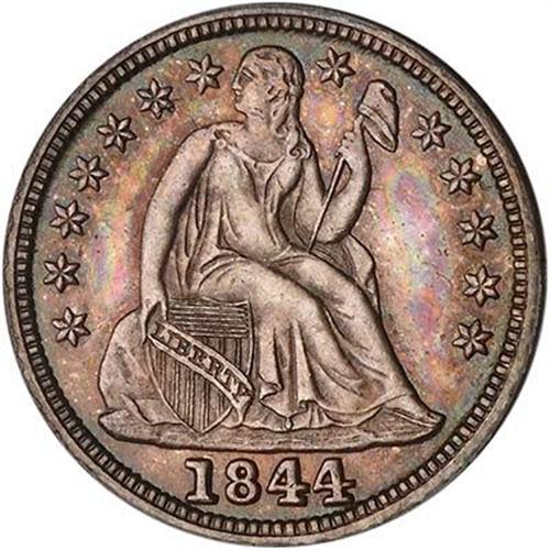 Decades ago the 1844 date was hoarded by a popular writer from Kansas City named Frank Ross, who then fed specimens from his stockpile into the market at much inflated prices. Ross is credited with bestowing the name "Orphan Annie" on the date, although no one is certain why he chose this name. The result was higher prices for 1844 dimes, and this is certainly reflected in the intense demand for this coin in Mint condition, which is more than 10 times as expensive as surrounding dates, and higher than the price of the rarer 1846.