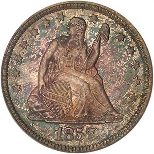 Housed in PCGS holder 5377824, this 1857 seated Liberty quarter dollar is, hands down, one of the most gorgeous toned specimens we have offered in quite a long while. A high degree of cartwheel luster spins gracefully underneath the golden, purple-gray, and steel-with-blue surfaces of this flashy and exciting gem. The strike is crisp in most places, though some weakness is noted at the top stars flanking Liberty.
