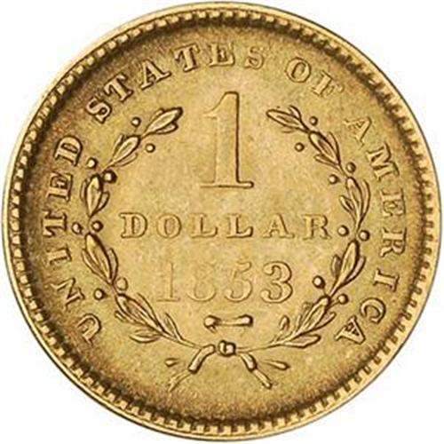 <B>$1 Gold Liberty. 1853 About Uncirculated 50.</B> Muted luster on both sides, but plenty