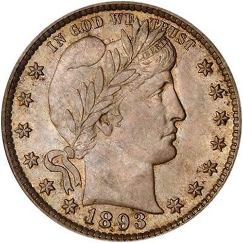 An well toned Barber quarter, a coin with smooth luster and a strike that is amazingly close to complete for this scarce branch mint date. Old-silver color russet and gray suggests that the present specimen spent much of its life in an Wayte Raymond album or perhaps a craft-paper coin envelope. In never came within a light year of a coin dip bath, fortunately, and now is proudly on display in its protective hard plastic case.