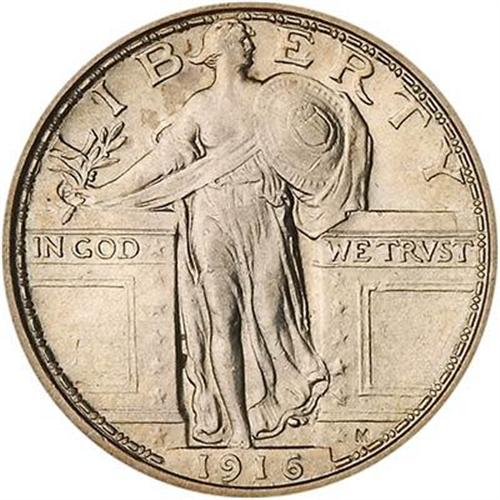 There is little to say about the surfaces of this coin as they are as near to perfect as imaginable for the modest assigned grade: The mint frost is smooth and satiny over each side, perhaps not vibrant and dazzling, but just the same complete and attractive. There is just a bit of light patina present as well, although mainly the coin is bright white. The top of the shield with mushy rivets; the bottom of the shield contains a few small marks. With a mere 52,000 minted, and generations of collectors turning over seat cushions praying to find one, the 1916 Standing Liberty quarter has taken on legendary distinction within the sphere of American numismatics. This is a charming coin that is stringently graded and a rock-solid value in today's quest for rarities.